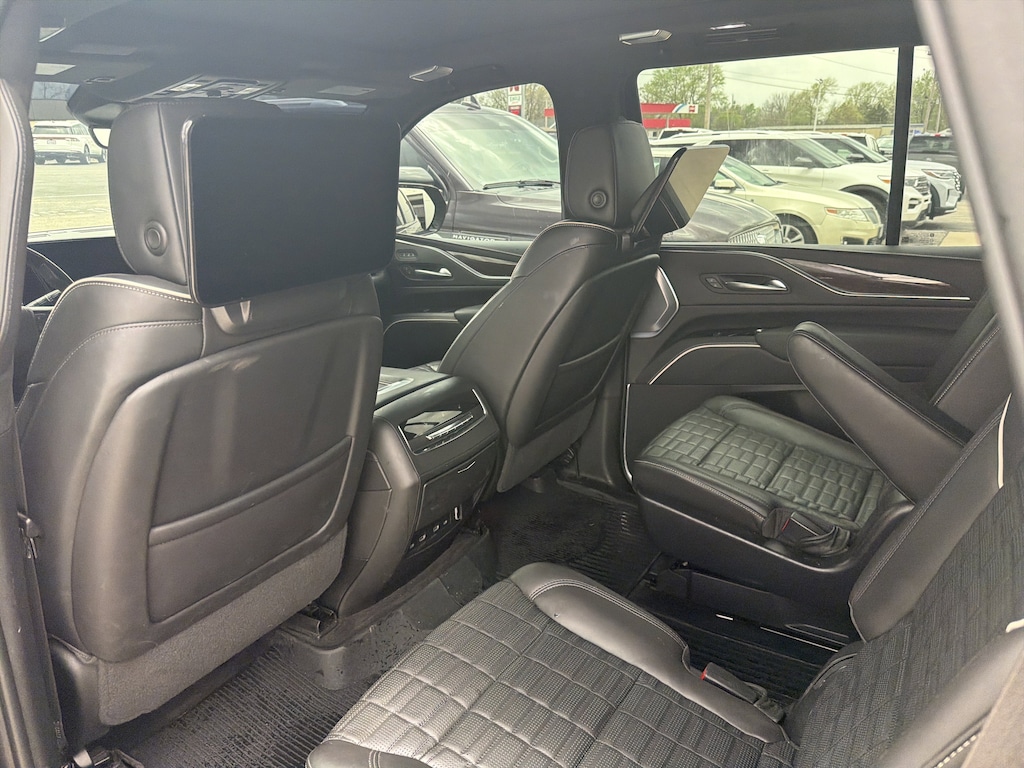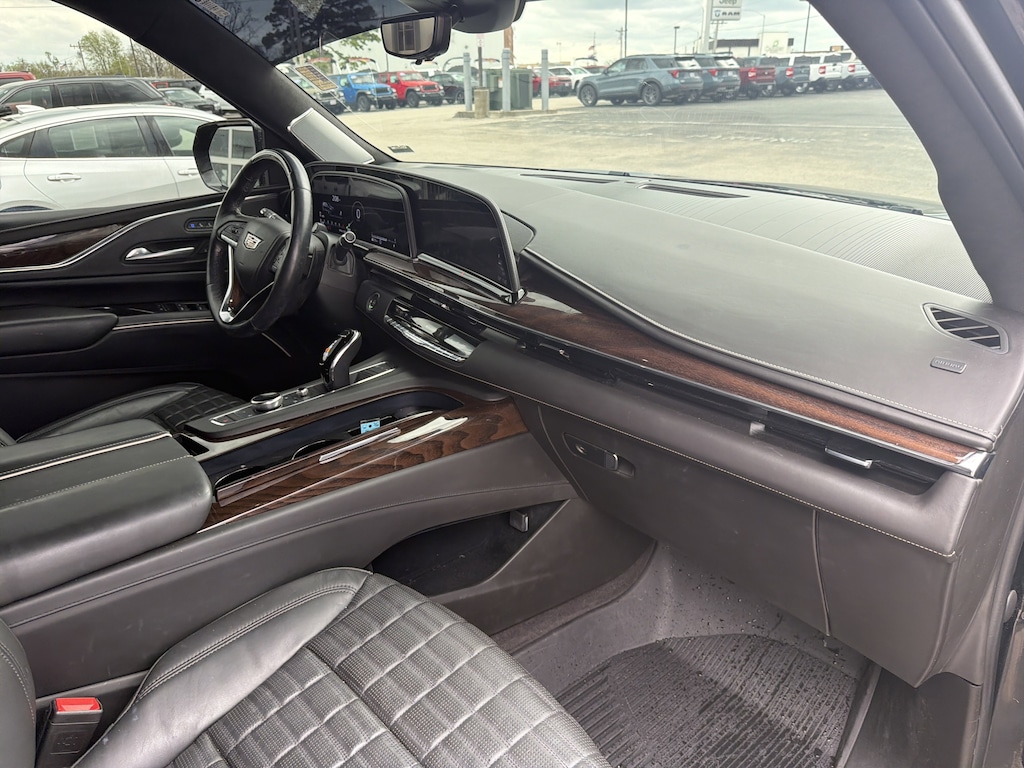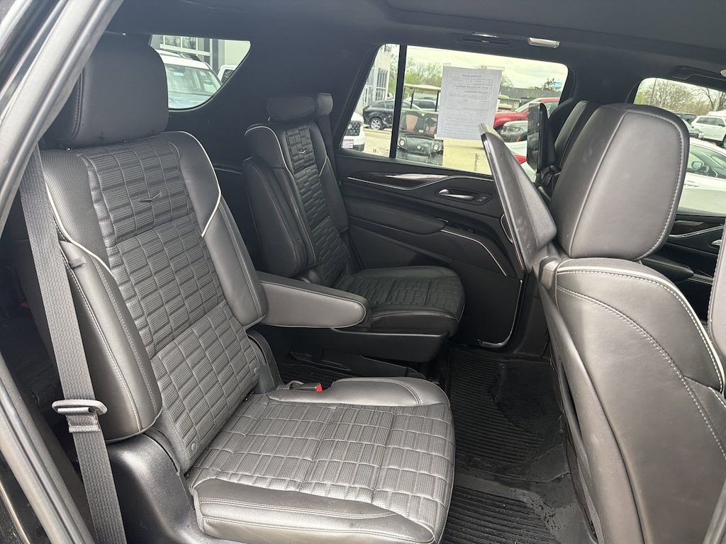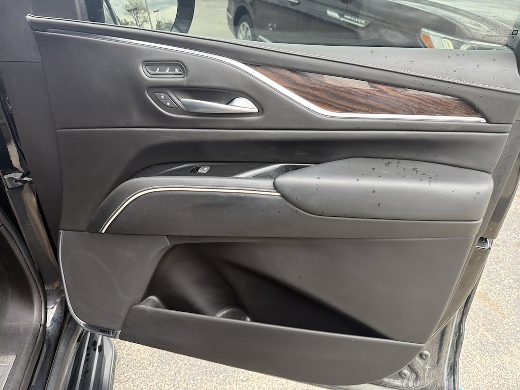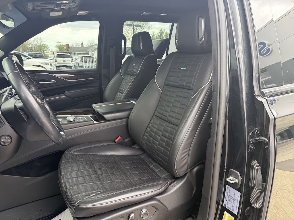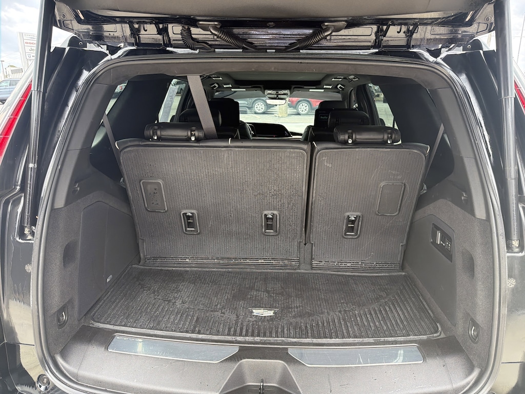 AWD, Black Leather, 16.9" Diagonal OLED Infotainment Screen, 2-Presets Memory For Driver Seat Adjuster, 3.23 Axle Ratio, 3rd row seats: split-bench, 4-Way Power Front Passenger Lumbar Seat Adjuster, A/V remote, Enhanced Automatic Emergency Braking, Enhanced Automatic Parking Assist, Front Bucket Seats, Headphones, Heads-Up Display, Hitch Guidance w/Hitch View, Illuminated entry, Integrated Trailer Brake Controller, Livery Package, Memory seat, Navigation System, Panic alarm, Power Panoramic Tilt-Sliding Sunroof, Remote keyless entry, Wheels: 22" 12-Spoke Polished Alloy. Black Raven 2023 Cadillac Escalade Sport Platinum AWD 10-Speed Automatic 6.2L V8